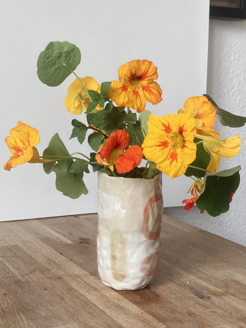 bemalt in beige, rot, celadon, gelb-spektrum, auf weiss und klar.