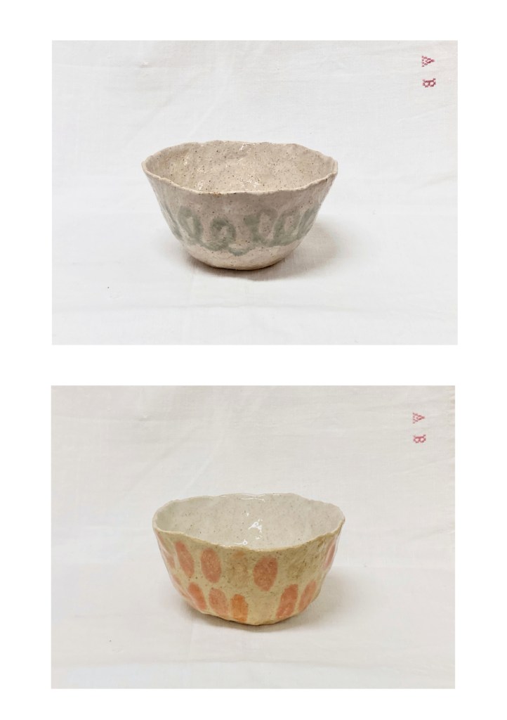 chamotte Ton, innen weiss glasiert, aussen ovale Flecken in rot, rosé und ochre –